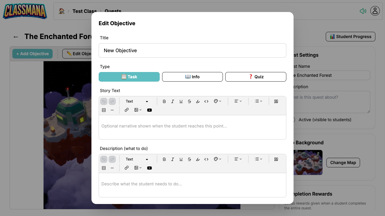 Quests lader dig omdanne opgaver og læringsaktiviteter til narrativdrevne eventyr. Du opretter visuelle kort hvor hver knude er et mål — en opgave, quiz, info-knude eller boss-udfordring. Elever skrider frem gennem kortet ved at fuldføre mål, låse nye stier op og tjene belønninger undervejs.