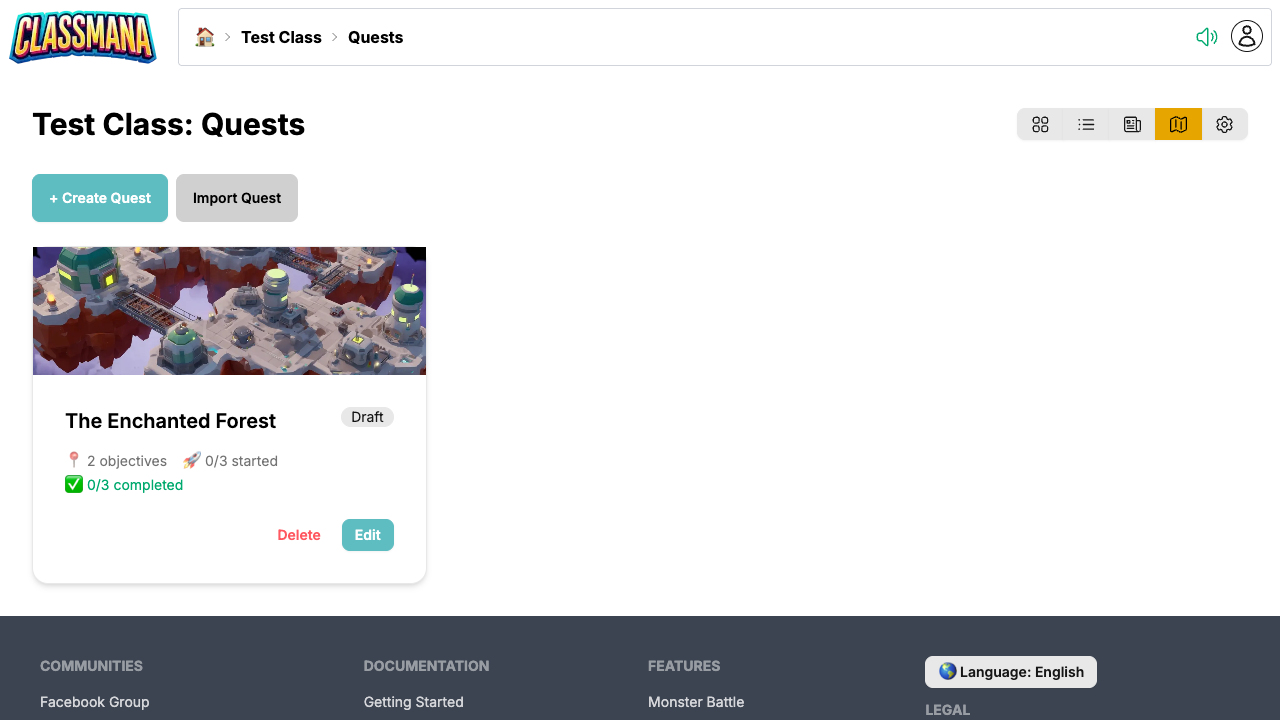- Fra klassedashboardet, klik på "Quests" i værktøjslinjen