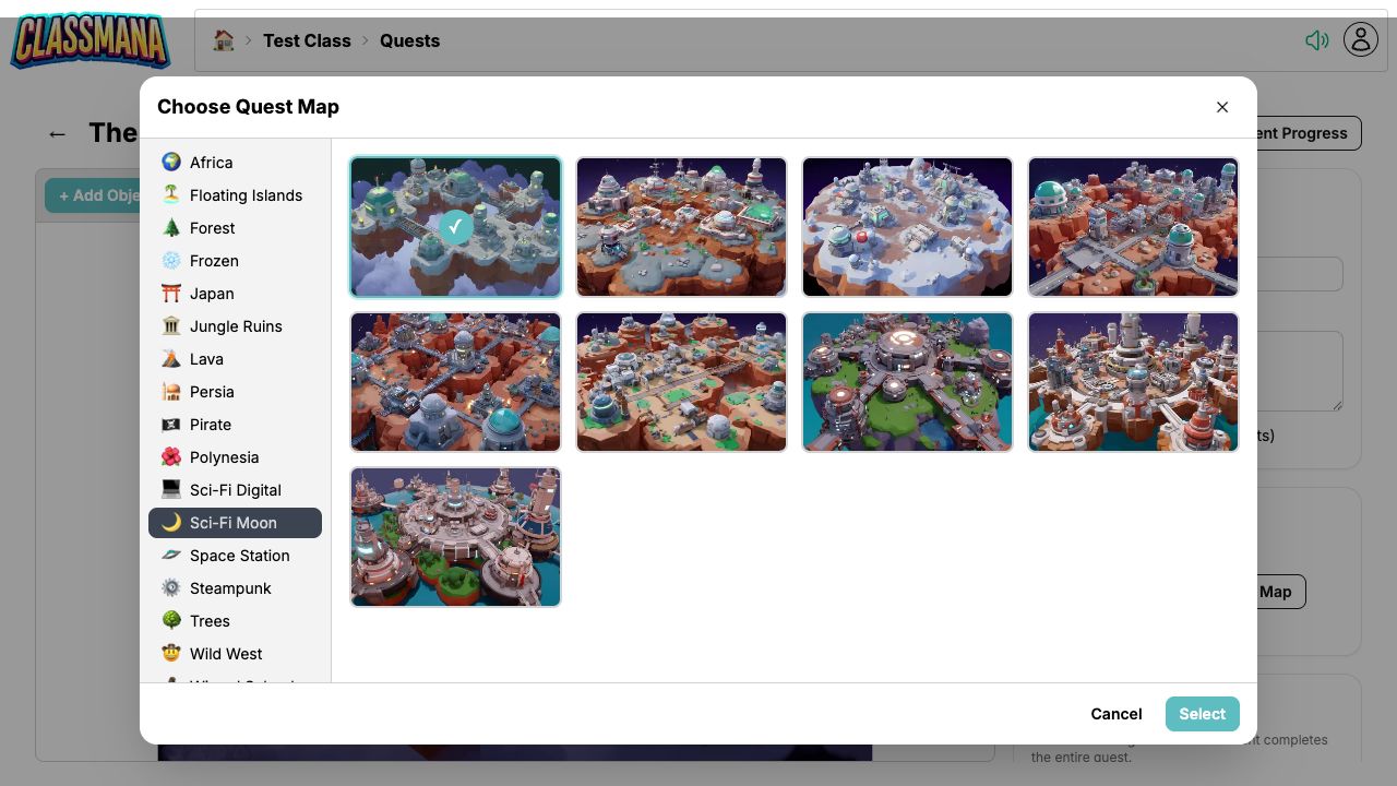 Der er over 200 unikke kort baggrunde organiseret efter tema: Afrika, Flydende Øer, Skov, Frosset, Japan, Jungle Ruiner, Lava, Persien, Pirat, Polynesien, Sci-Fi, Rumstation, Steampunk, Det Vilde Vesten, Troldmandsskole, Eventyrland, og mere. Vælg en der passer til din lektions eller enheds narrativ.