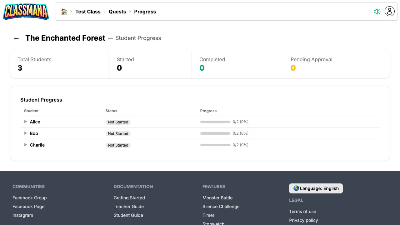 Overvåg dine elevers quest fremskridt fra den dedikerede fremskridt side: