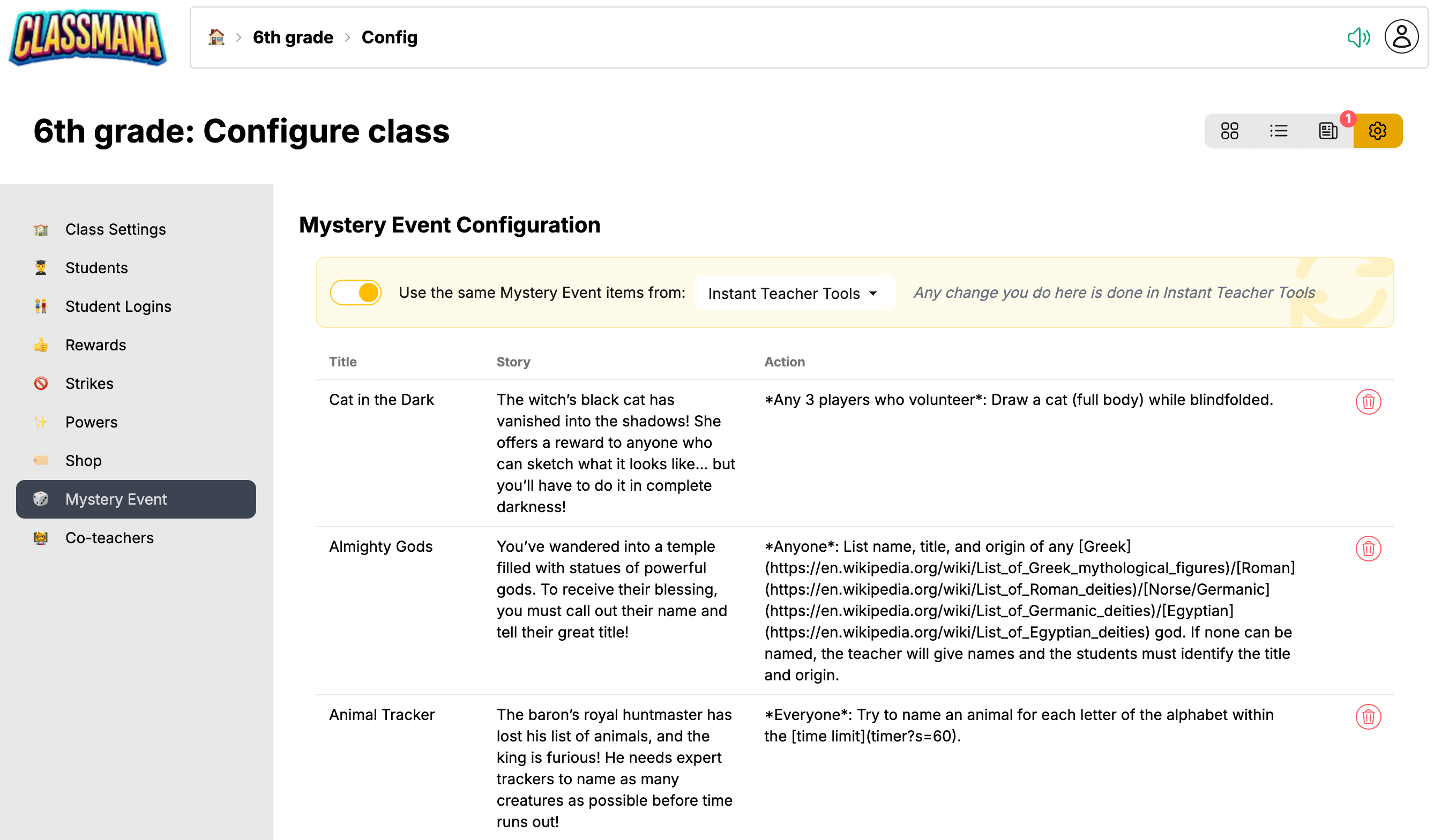 Når du bruger Mysterie-begivenheder inde fra en klasse, kan hver klasse have sit eget sæt begivenheder — eller synkronisere dem fra en anden klasse. Få adgang til det fra din klassekonfiguration under 🏠 Dashboard → Klasse → ⚙️ Konfiguration → 🎲 Mysterie-begivenhed