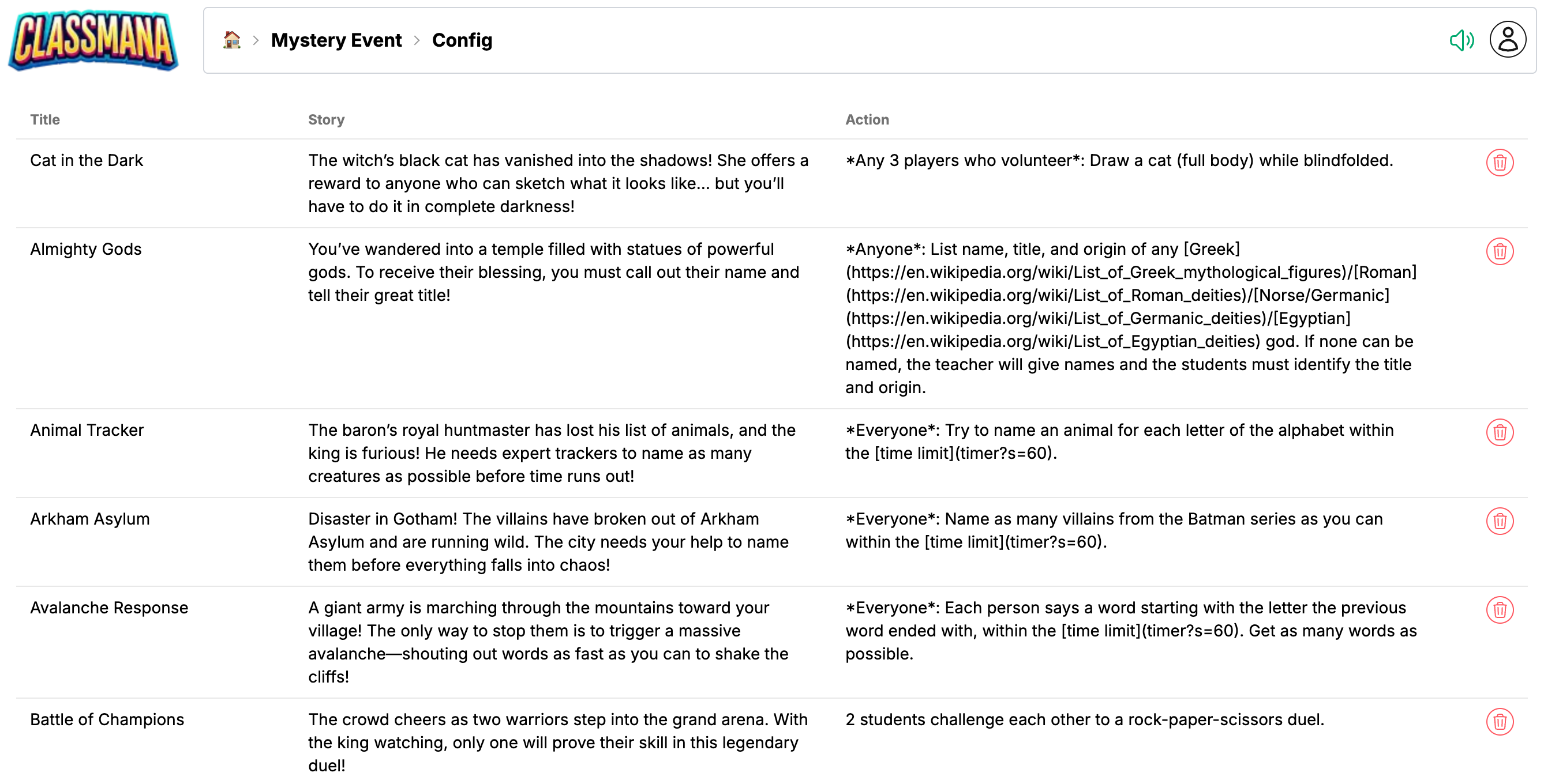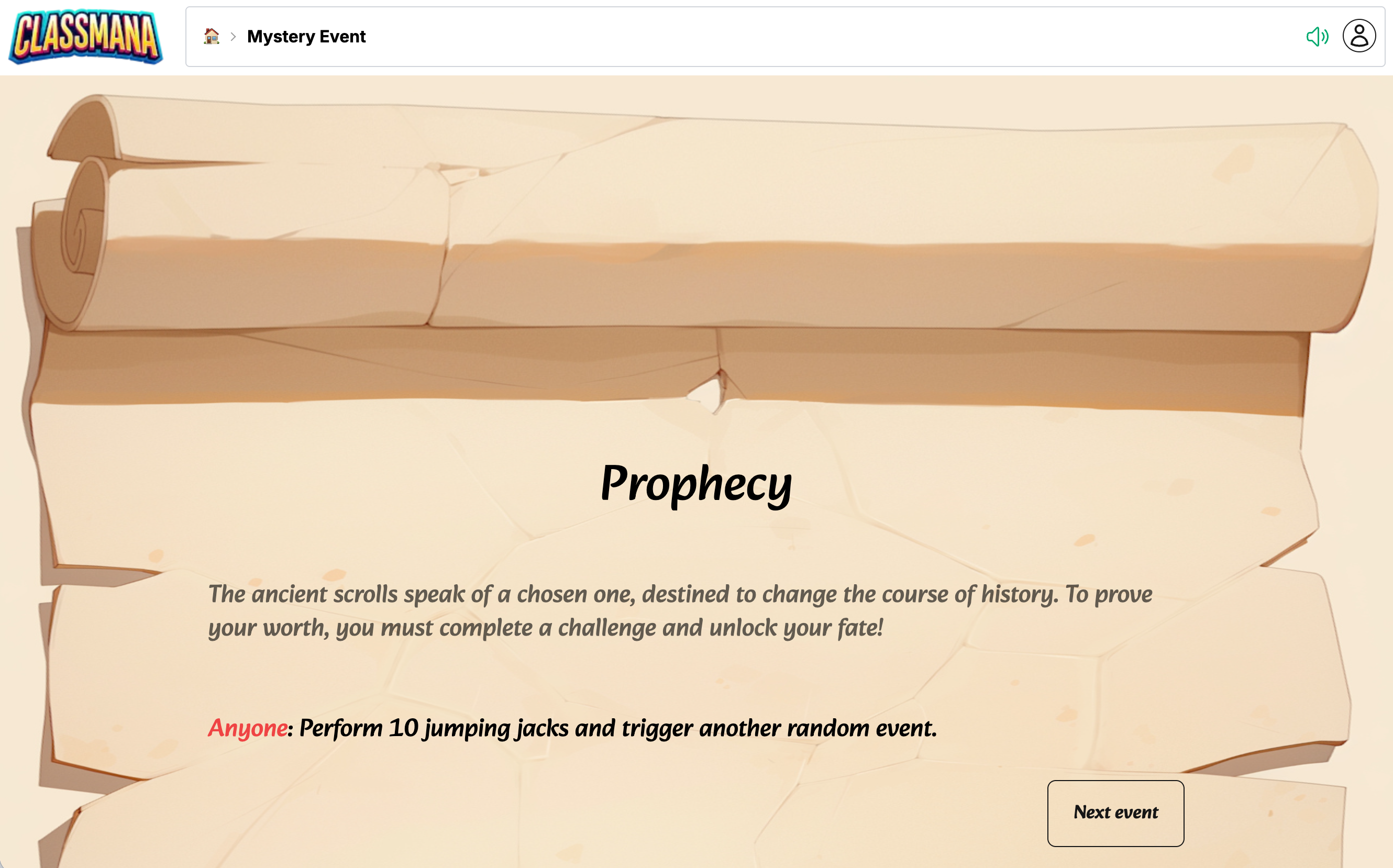 Mysterie-begivenheder er sjove, hurtige aktiviteter til at holde din klasse engageret. Brug dem til at starte din time med spænding, som belønning eller som hjernepause. Hver begivenhed tager 1 til 5 minutter og tilføjer et overraskelseselement til din klasserutine.