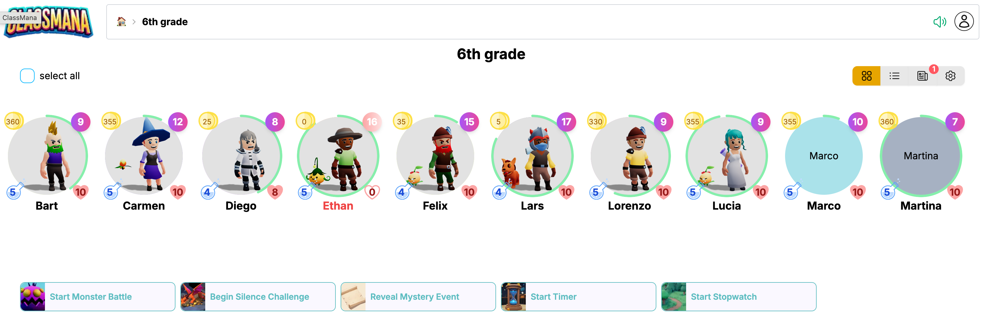 Denne version inkluderer alle funktionerne nedenfor PLUS muligheden for at belønne elever med erfaring, mana og guld, eller trække sundhedspoint fra.